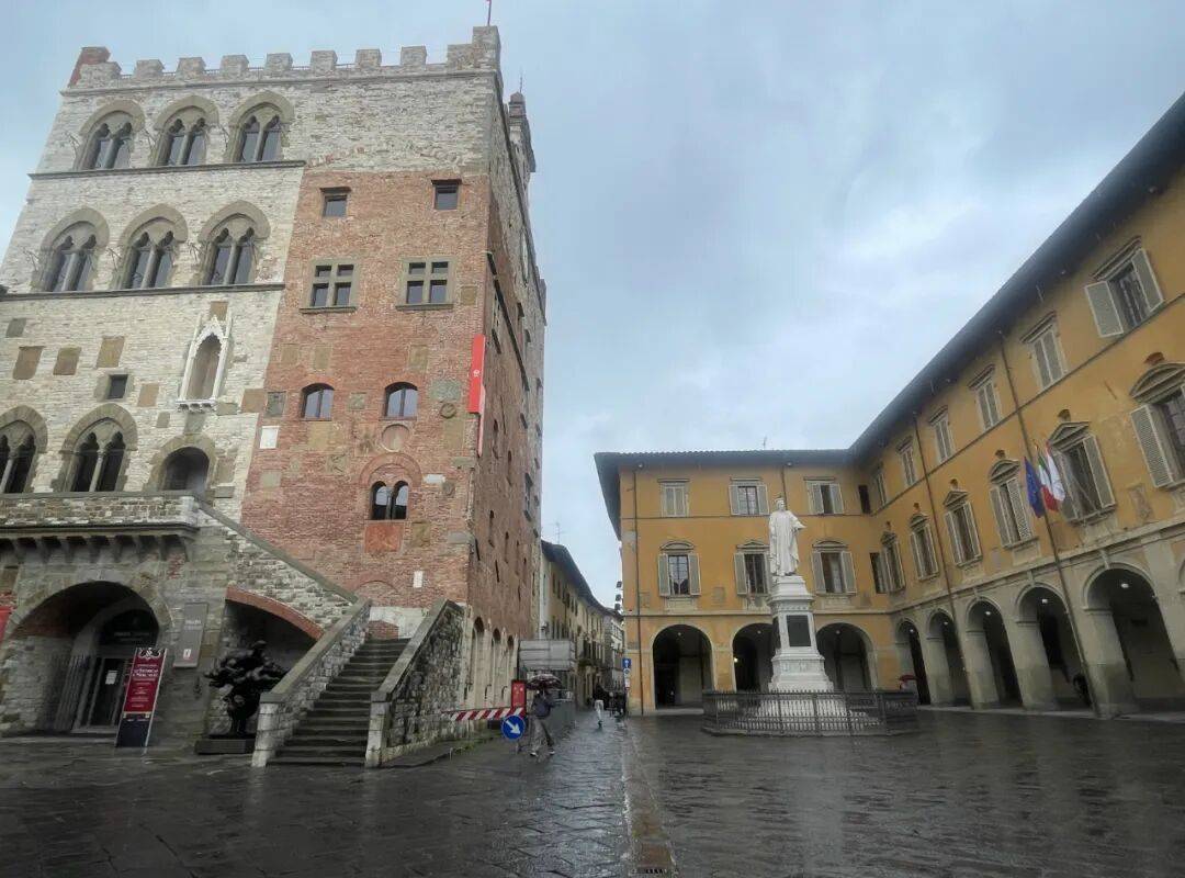 临时占领的纪念碑,与普拉托另一座永久性雕像形成了意味深长的对照。在古城中心的市政厅广场上,竖立着十四世纪商人弗朗切斯科·达蒂尼(Francesco Datini)的大理石雕像,他身披长袍,凝视远方,矗立于石台之上,代表着这座城市自我叙事中引以为傲的形象:一位远赴他乡、在法国起步并积累财富的企业家,他以纺织与贸易为核心的商业网络跨越阿维尼翁、热那亚、巴塞罗那和马略卡。达蒂尼雕像所代表的,是一种资本主义萌芽期的成功逻辑——跨国流通、产业扩张与财富积累。而今,在资本主义高度发达的当下,达蒂尼的遗产在他的家乡以某种形式得到了延续,“普拉托商人”已然活跃在全球版图上,只是,这个话题谈起来有些棘手。
